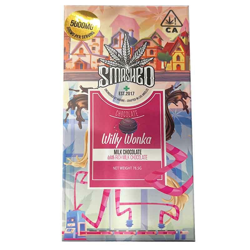 Smashed chocolate bars with cannabis-infused into the chocolate. The term “smashed” might imply that the chocolate has a unique texture or incorporates additional ingredients, such as crushed nuts or candies, in addition to the cannabis infusion. The Smashed “Willy Wonka” Milk Chocolate Bar is a cannabis-infused edible offering a rich milk chocolate experience combined with a potent 5,000mg of THC per bar.